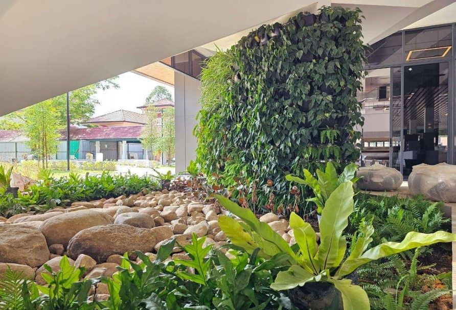 Under the bridge crossing from residential block to the podium, it was decided that a mix of low-light tolerant species should be used instead due to the semi-shaded conditions, below is an image taken more than a year after installation.