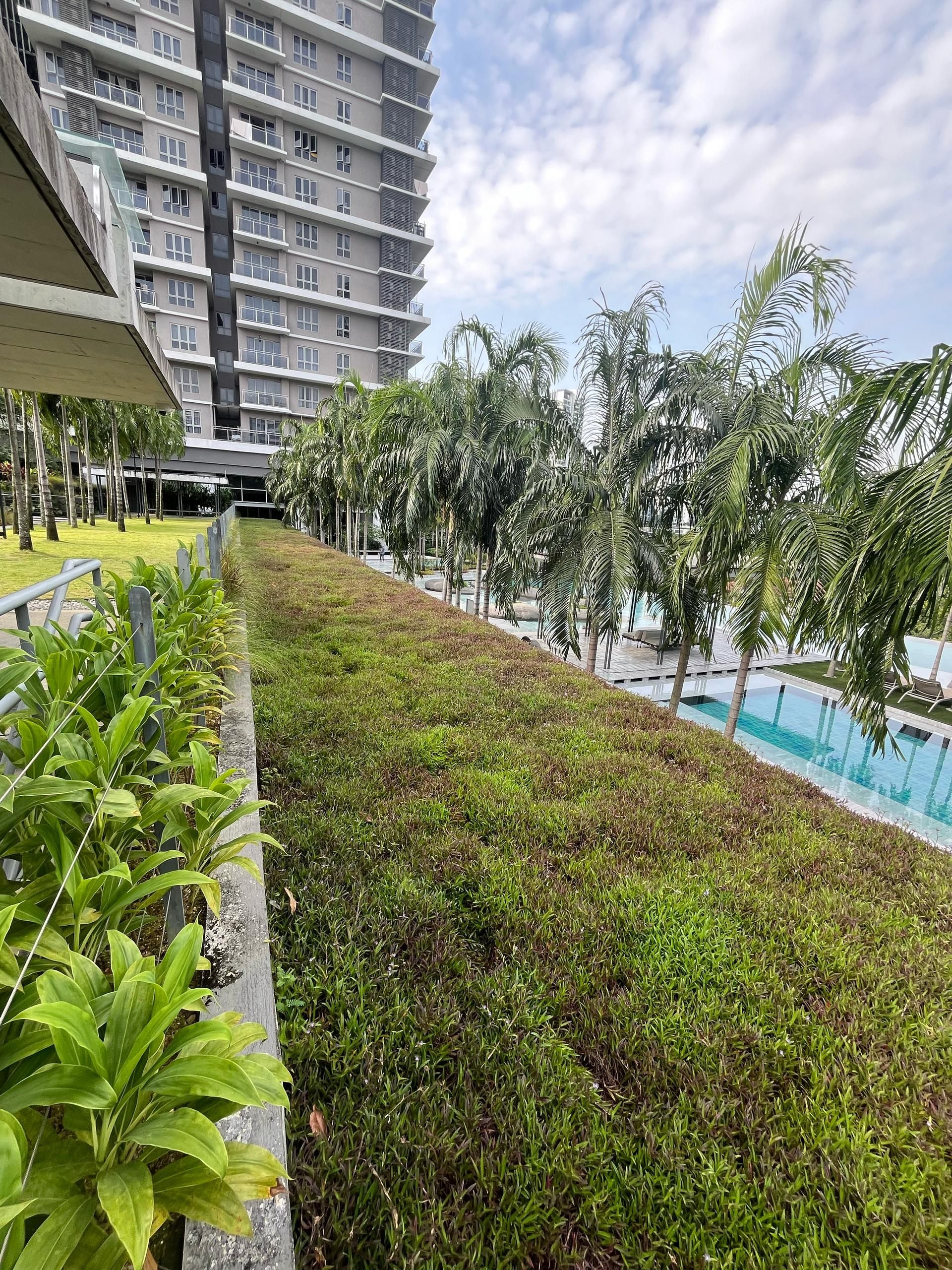 屋根のメンテナンスを年間10~12回のメンテナンス訪問で行えるよう、メンテナンスの手間が少ない多種多様な植物を選定するという設計意図を考慮しました。丈夫なベースプラントの赤と緑に加え、温室のガイアマットシステムには、モンスーン/雨季に見られるレインリリーが散りばめられています。